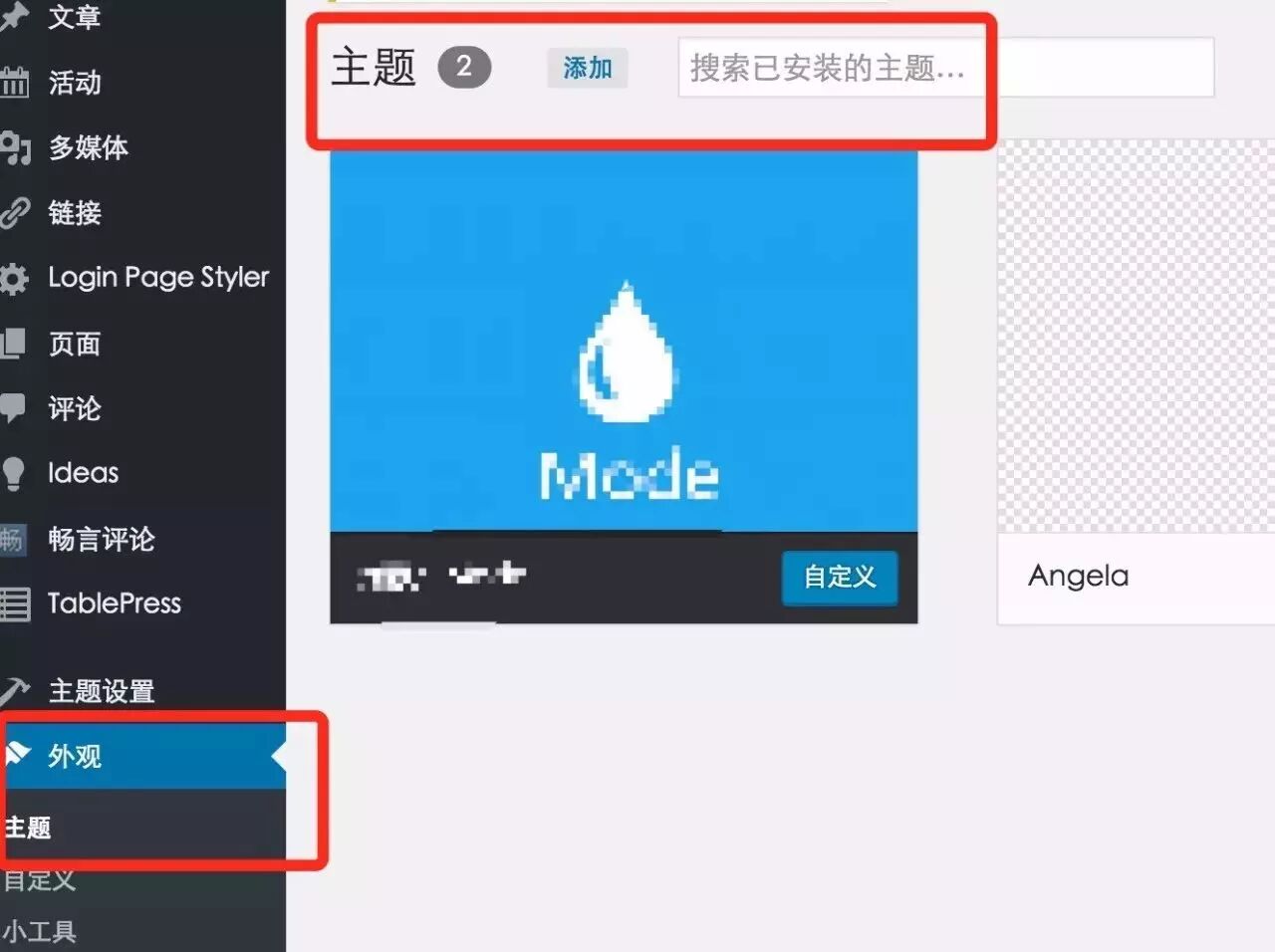 主题管理在外观里,插件在外观下。跟安装主题一样,点击安装插件,可以搜索平台提供的插件,也可以上传自己电脑里的插件。
