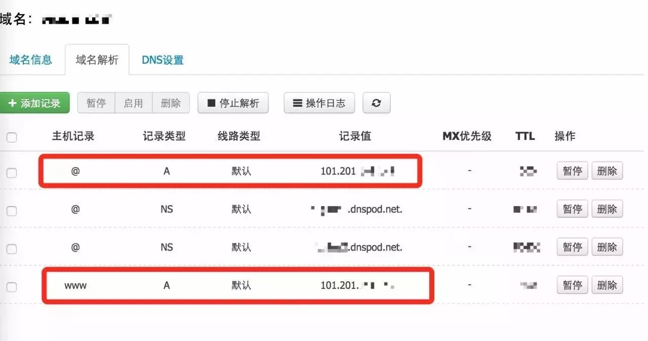 添加两个记录(参见红框),填入所购买主机的IP地址