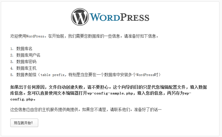 上一步完成后,点击“现在就开始!”,出现下图的页面,把新建的数据库、用户和密码填入下图红框处