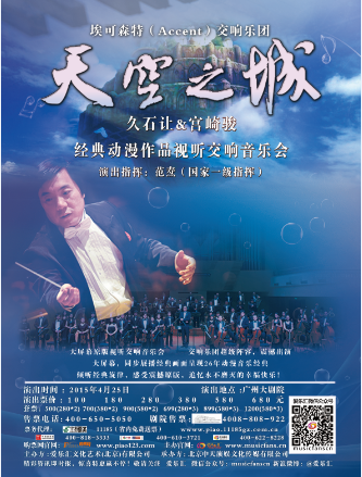 2015年4月25日晚20:00,国家一级指挥范焘将在广州大剧院奉上《天空之城-久石让•宫崎骏动漫作品大型交响视听音乐会》,4月26日15:30在星海音乐厅奉上《哆唻咪和大灰鸡亲子故事音乐会》。