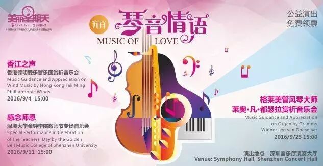 “美丽星期天”免费公益音乐会是深圳市音乐厅公益文化品牌活动,因演出时间定在了每个公众休息日周日的下午,因此,它也有了一个美丽的名字——“美丽星期天”。音乐会通过邀请专业演奏团体或演奏家、教育家,选取通俗易懂的曲目,以边讲边演的方式,向观众介绍古典音乐会的基本礼仪、常识及欣赏的方法。音乐会的类型涵盖多个方面,如交响乐、管乐、独奏、各种室内乐、合唱、声乐、民乐等,以及以音乐为主题的讲座。