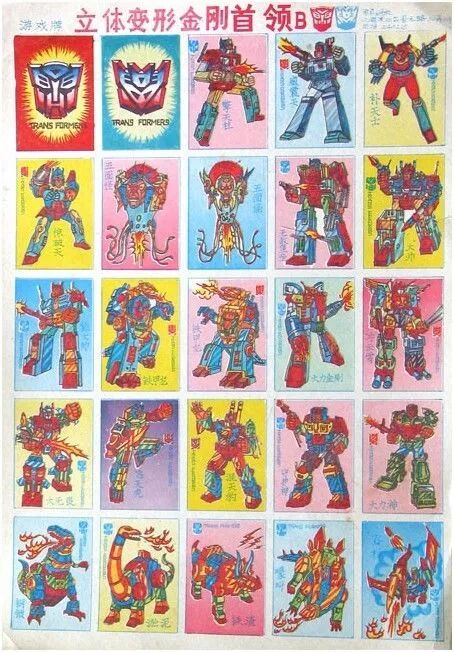 1988 年 7 月 30 日 17 点 08 分,《变形金刚G1》动画在上海电视台首播,并迅速在全国数百家城市电视台及部分省级电视台陆续播出。不到一个月,便有类似商品在各地商场上线,而民间更是有数不胜数的盗版玩具流传,甚至还有表明了各个角色的「卡牌」。当时的学生们用自己的卡牌去挑战三街四巷,扇、打、扣、翻,胜者可以夺取对方的卡牌,败者只能眼巴巴的看着自己的「大黄蜂」「钢索」被对方夺去。这一游戏形式,也被此后的中国学生延续下来。