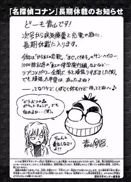 动画版《名侦探柯南》改编自 1994 年开始在小学馆《周刊少年SUNDAY》连载的漫画,至今仍未完结,因此成为 SUNDAY 史上连载时间最长的作品。而在 2017 年 12 月 11 日,原作者青山刚昌宣布,「从下期开始,由于生病疗养和充电需要,柯南将进入长期休载」。与此同时,在休载前的最后一期漫画作品中,青山刚昌终于公开了「黑衣组织」的 BOSS 身份——乌丸莲耶。最早出现于漫画第 30 册,而那已是 17 年前的事情了。