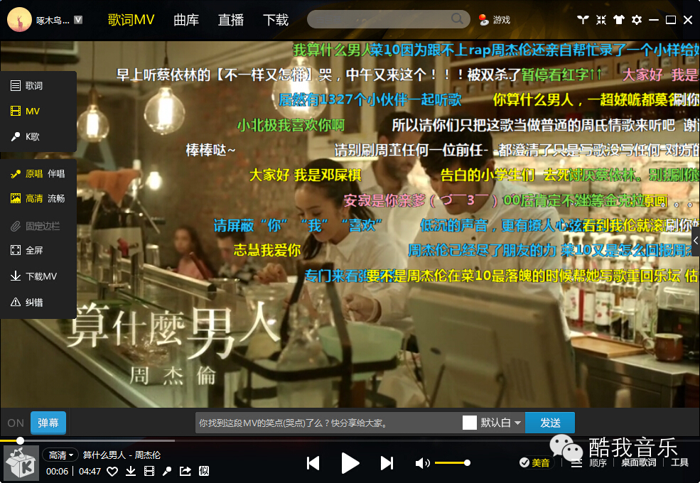 视频皆可以弹幕,为什么看MV不能弹幕呢?2015,爱是永恒版,就是要让弹幕版MV给你不一样的视听感受。不是每首都要弹,而是精挑细选地去弹。酷我音乐PC版会推出“每日一弹”的专题,每天选取一首热点MV,让你在吐槽中享受音乐,在互动中挥洒情绪。你能想象在观看各种高清MV时,同时闪现数百条评论是什么样的状况吗,总有一条能戳中你的笑点,也总有一条能戳爆你的泪腺,当然,也总有一条能刺激你的膀胱!