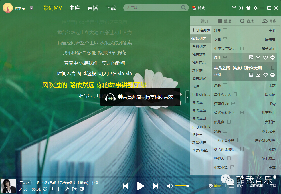 一首你感兴趣的歌,不一定能找到无损音质版本,于是,你的聆听便谈不上享受。美音智能音效,一个能让耳朵“醉死”的功能,轻松一点即可触发该功能,一首干瘪音质的歌曲几乎成为了无损音质的金曲;如果你恰好此刻戴着魔音耳机或开着完美音箱,此刻你的不要惊讶,对,你听到的正是“现场音乐”!