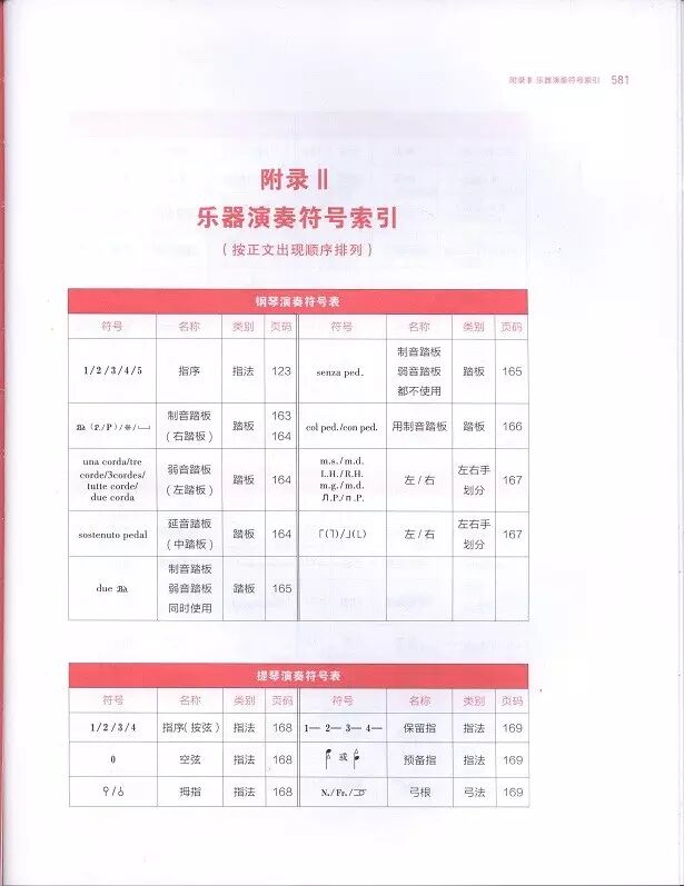“乐器演奏符号索引”对《规范》词条中的演奏符号的形状、名称、归类、页码等,以表格的形式逐一列举,为查阅检索提供了便利。