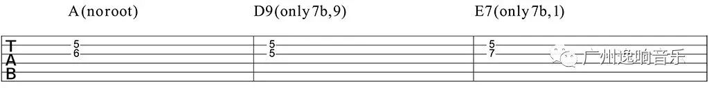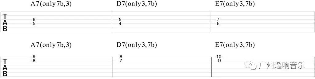 前两组手型用同样的指法平移,就走完了这三个级数。A7和弦,食指按的是这个和弦的7b,中指按的是第3音。第二个是IV级D7和弦,食指按的是D7和弦的3,而中指是它的7b音。然后是V级和弦,手型是D7的平移,也就是E7的3和7b音。(见下图)