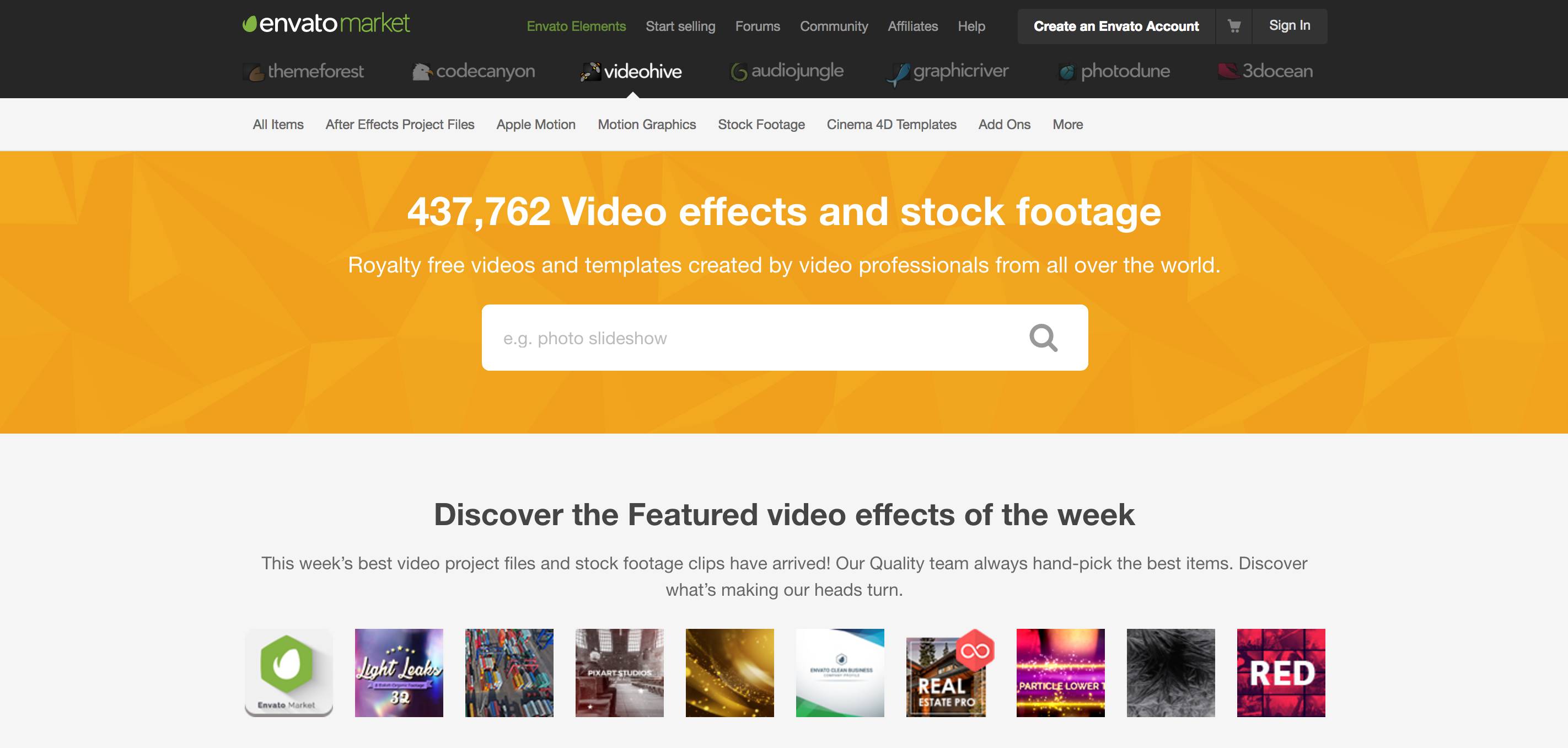 videohive 也是一个综合性较高的素材门户,当然除了音效,还有很多特效素材的提供,该门户分为国际版和国内版,而国际版的内容素材量优质,种类也比较丰富,所有素材都需要支付费用。但是该网站的素材确实质量较高,有非常多的声画效果值得参考。