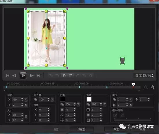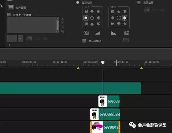 1)在覆叠轨1插入一个绿色的色块作为背景,然后右键图片设置自定义动作,自上而下做运动,视频里有个向上弹了一下的效果,这个需要给第一个关键帧设置个缓入,第三个关键帧设置个缓出运动曲线即可。