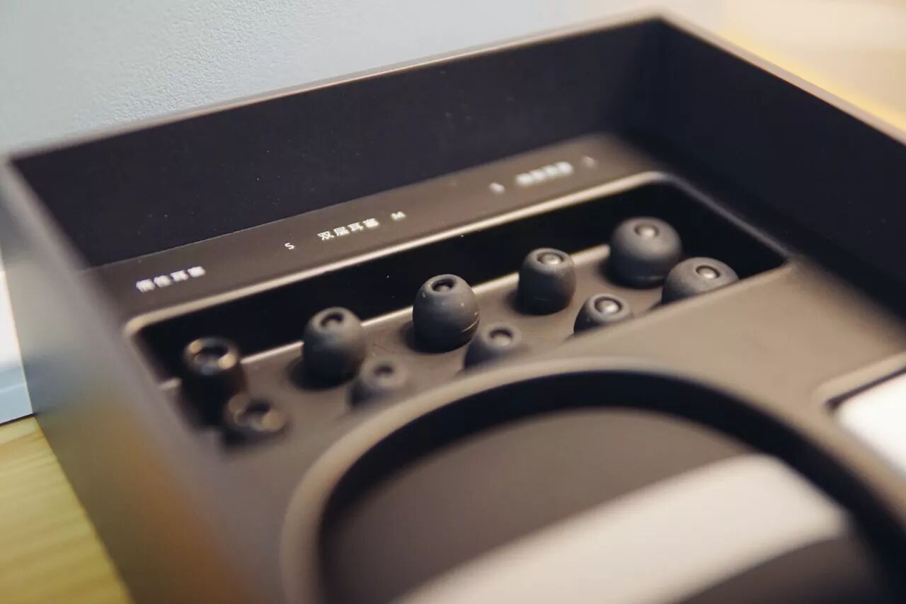 揭开上层,下面就是随耳机附送的各种附件。有各种尺寸大小的耳塞,收纳耳机的小套子,以及一个可以转接电脑用的二和一转接头。