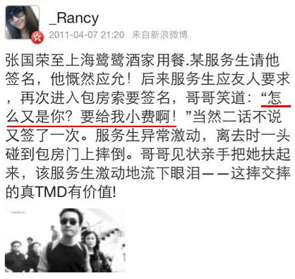 因为早些年,她因为心情不好半夜在路边哭,张国荣路过停下车一直安慰她,当时这个女人状态不好,一直让哥哥走开。