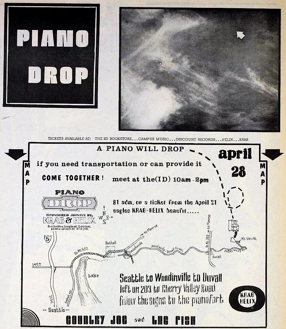 这个所谓的“掉钢琴”活动,指的是用直升机把一架钢琴吊到天上,然后让钢琴从天上掉落,砸在预先准备好的木堆上。为了搞气氛,他们还找了一支乐队到现场演出,Country Joe and the Fish。
