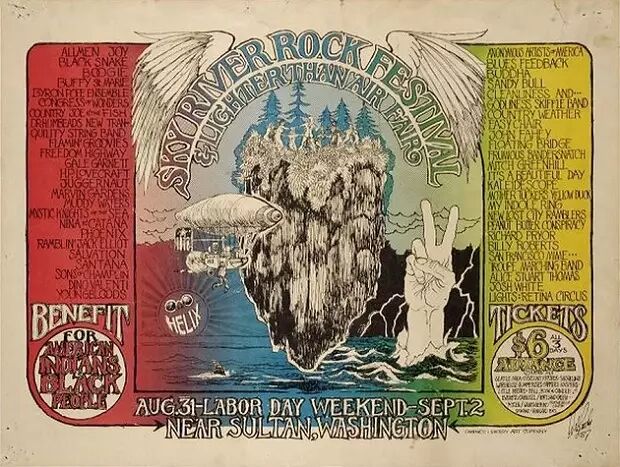 在伍德斯托克差不多整整一年前,也就是1968年,华盛顿州的Sultan市就举办过一场叫Sky River的摇滚音乐节,当时参加人数超过了2万,演出阵容则有20多支乐队,什么风格都有,民谣、布鲁斯、爵士、摇滚……后来感恩而死乐队也去了,且是在未通知主办方的情况下。说Pink Floyd本来也要演的,但因为舞台周围泥泞不堪,他们没法儿搭设备,所以最后取消了演出。这些都从一个侧面说明这个音乐节的受欢迎程度。