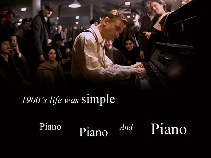 男主人公,1900,一生与船为伴,与琴为生,未踏及陆地一步.那是导演本人借演员之身还悟出人生的哲理:那片充满着冒险家的乐园,流动着赤裸裸的欲望,任何一个被上帝宠爱的孩子,在这片土地上,都活不长久.
