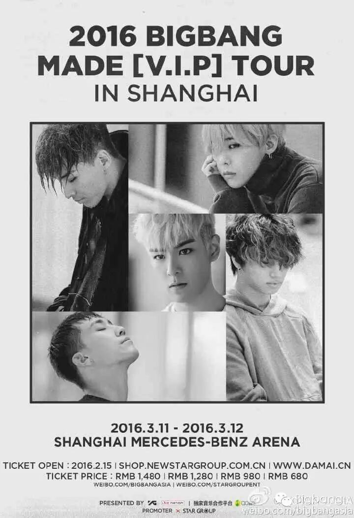 2016 BIGBANG MADE [V.I.P] TOUR 巡回演出即将启航,巡演城市:上海、深圳、郑州、南京、合肥、杭州、南昌、长沙。IME娱乐集团将与YG Entertainment / Live Nation Korea 携手启航,聚力再创辉煌。首先开票上海场,将于3月11日和3月12日一连两晚在上海梅赛德斯奔驰文化中心举行!