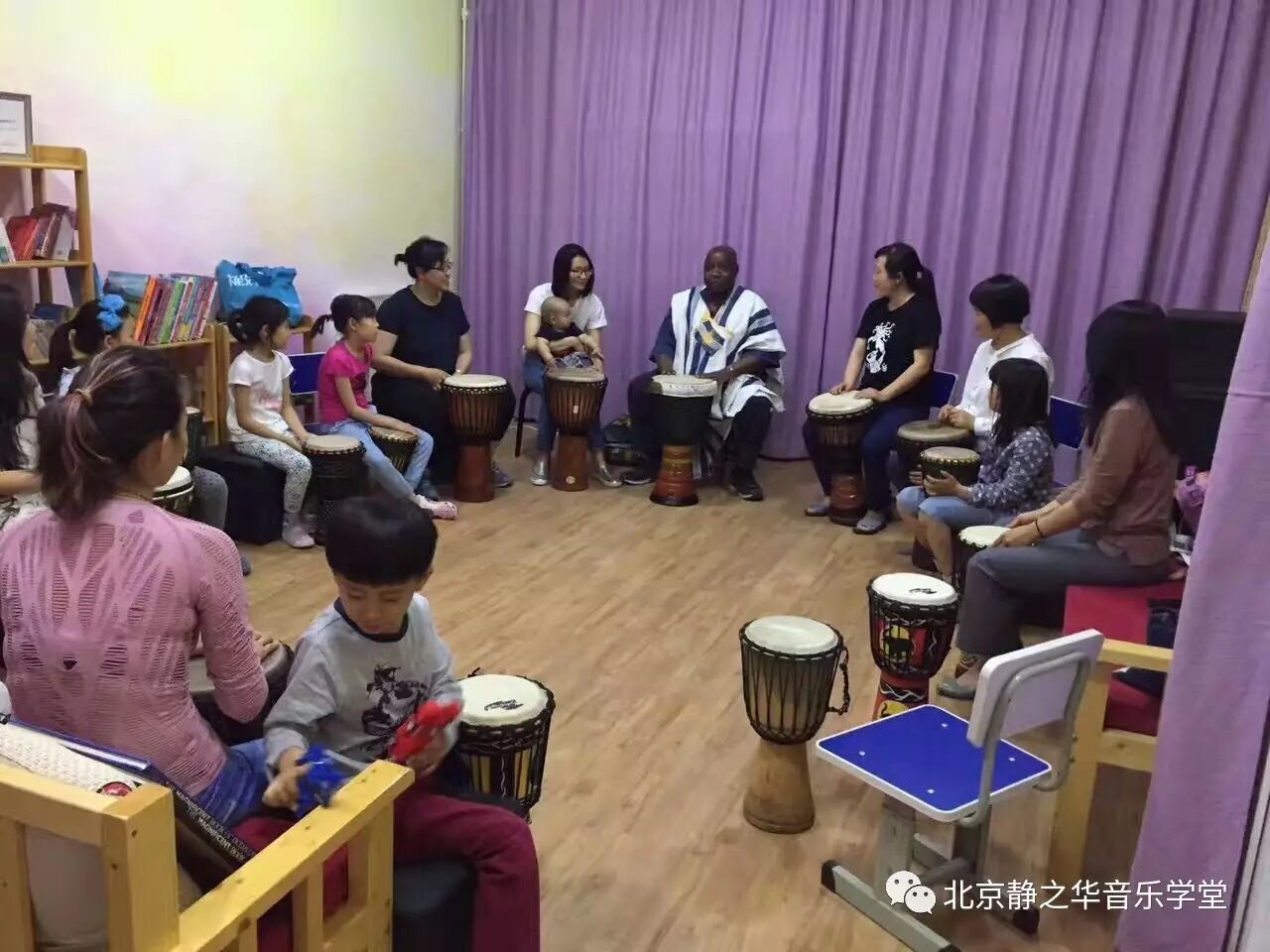“豆妈英语阅读馆”的豆妈,也是我们非洲鼓乐团的一位鼓友,上学期他们邀请了法国手鼓大师Mr.B老师为家长和孩子们上了一期亲子非洲鼓课,玩游戏,打鼓,唱歌,舞动,喜悦与快乐伴随着他们,共度了美好的亲子音乐时光!