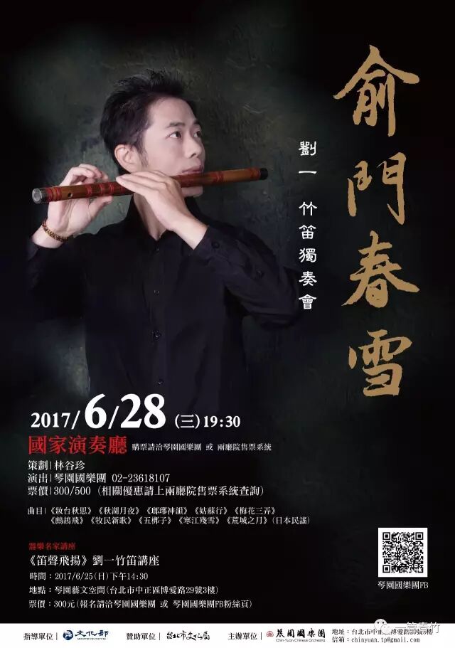 除了精彩的竹笛艺术讲座,“俞门春雪”刘一竹笛独奏音乐会将于2017年6月28日晚19:30在台北“国家”音乐厅举行。欢迎乐友们莅临欣赏。