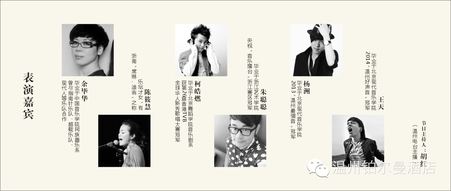本次演唱会是温州铂尔曼酒店打造的“铂尔曼之夜”系列文艺沙龙第七场,由温州铂尔曼酒店和温州市流行乐团主办,本报《6排8号》栏目和温州市流行音乐协会等协办。演唱会汇聚了70后、80后、90后温州音乐界知名人士,是各个时代的温州流行音乐代表人物,其中包括曾与指南针、超载、现代人等乐队合作过的余毕华,乐坛才女、有浙南“席琳·迪翁”之称的陈筱慧,第26届香港TVB全球华人新秀歌唱大赛冠军柯皓燃,央视“音乐擂台”浙江赛区冠军朱聪聪,2013“温州最强音”冠军杨洲以及2014“温州好声音”冠军王天。本土乐坛中坚力量与新生代新星同台献艺,展现温州流行音乐人的实力和风采。本土最火热的选秀节目“温州最强音”和“温州好声音”总导演、著名音乐人何畏挂帅担纲演唱会总导演,力求打造本土华丽炫目的流行音乐巅峰试听盛宴。歌迷们不仅能听到耳熟能详的老歌,还能收获新编歌曲带来的试听惊喜。 ![]()
