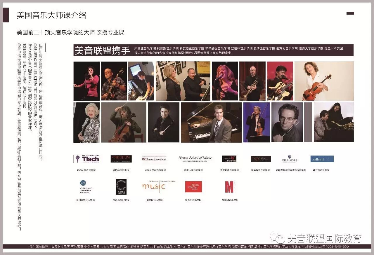美音联盟国际教育提供美国20多所顶尖音乐学院的深度访谈,多类型音乐平台的海量演出机会, 同时提供美国音乐大师课的视频教学及面授,致力于为音乐专业学生提升个人背景提供更多更有价值的机会和途径。
