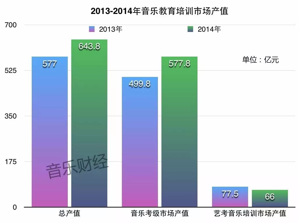 报告显示,2014年社会音乐考级培训、艺术高考音乐培训的总产值为643.8亿元,较2013年同比增长66.8亿元。虽然83万人的艺考音乐培训市场产值同比下降了11.5亿元,社会音乐考级培训的总值却上升了78亿元,这说明音乐教育已经不单单指向艺术专业的求学者,而是更加趋向大众化。