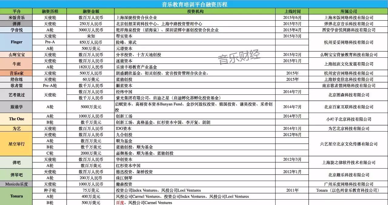 今天,我们盘点了从2015年至今,O2O、视频教学、智能硬件以及音乐教学和练习辅助应用4个方向上,获得投资的典型音乐教育培训平台及应用,也列举了一个O2O寒冬下融资失败的案例。