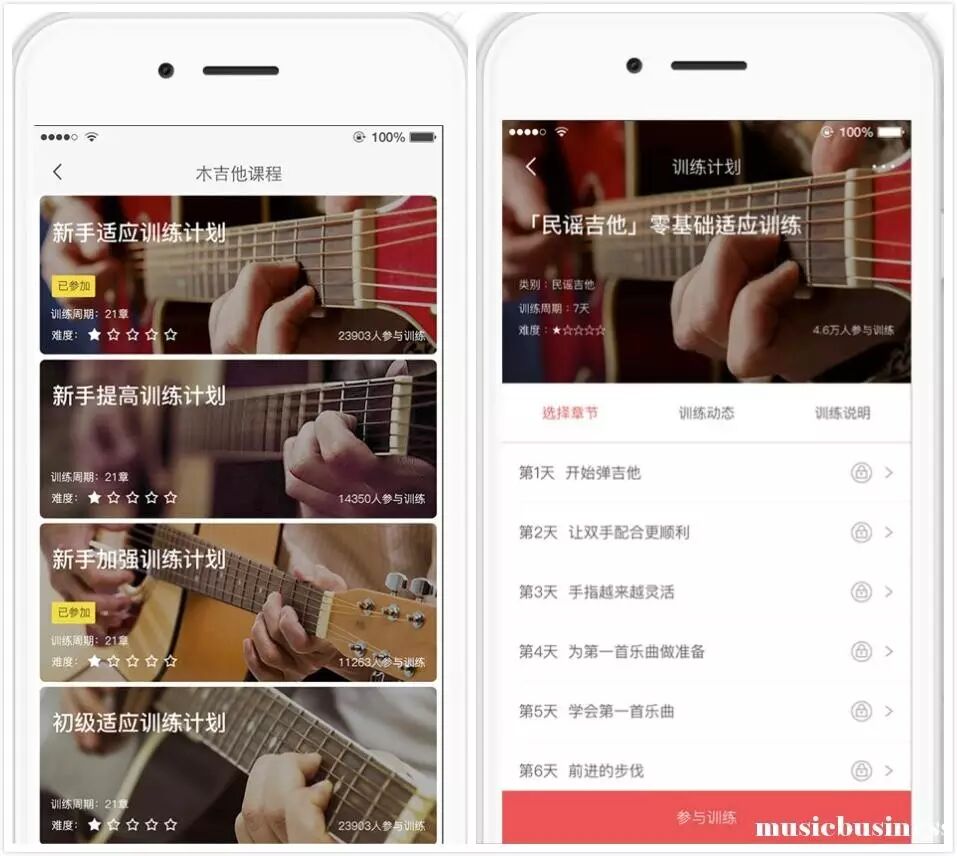 Finger的课程免费,教学内容采用PGC的形式,用户可在训练区看自己已下载的课程和训练的总时长,也可在达人社区看优质达人的现场教学视频。同时,曲谱板块还为用户提供了留言发帖的平台来寻找免费曲谱。目前平台上共有尤克里里、电吉他和民谣吉他三类教学课程,时常一周到三个月不等。