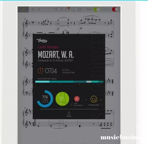 作为一款乐谱应用程序,Tonara最大的优势就是解放了演奏者的双手,它可以根据用户弹奏乐器的节奏在ipad上实现自动翻页。目前,Tonara可以识别钢琴、小提琴、中提琴和大提琴四种乐器。不仅如此,在用户弹奏结束后,Tonara还会生成一个涵盖用户弹奏时长、速度以及演奏水平的报告。用户也可利用Tonara的录制功能,将演奏过程录制下来并分享到社交网站上。