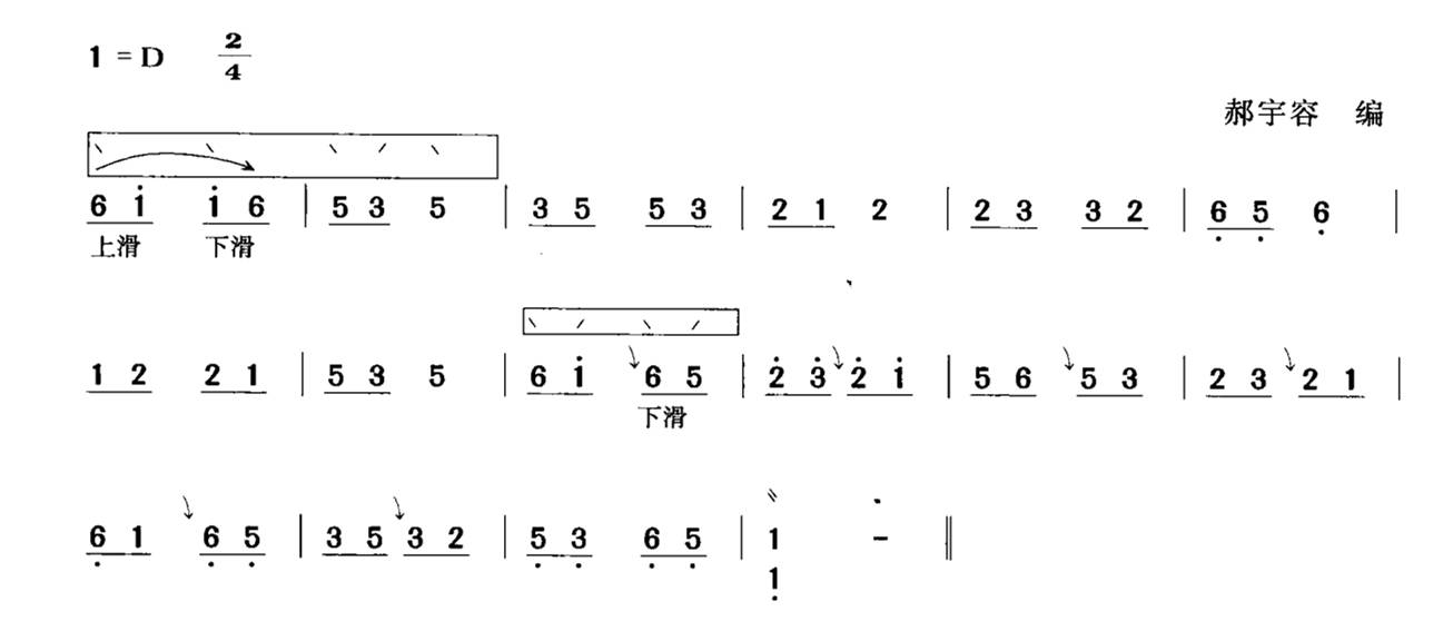 注:从高音位滑到低音位称注 (右手必须标明指法,不标者为虚注)。在谱面上运用相同符号,其谱面符号为“绰”与“注”的区分是根据音的高低来确定的。