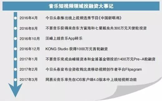 2016年4月今日头条推出一档名为《中国新唱将》的线上视频选秀节目,并拿出10亿元补贴短视频创作。今年初,今日头条全资收购北美移动视频创作平台Flipagram,而Flipagram的独特性就在于用户可以在视频中添加60秒的热门音乐。随后,今日头条邀请钟立风等独立音乐人入驻以及职业音乐经理人入职,一系列布局也被业内解读为今日头条意在以音乐短视频为突破口,进一步进行音乐产业布局。