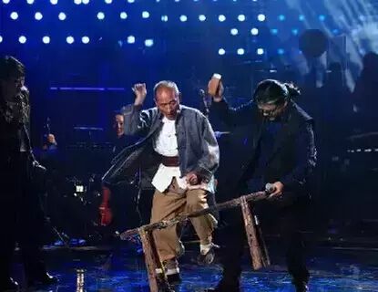 《中国之星》第三场比拼,9位歌手纷纷使出杀手锏,其中,谭维维请到陕西华阴的老腔艺术家伴奏,将摇滚乐与老腔表演结合起来。现场演奏的5位老腔艺术家中,有一人使用枣木敲打条凳发出声响,这一独特的演奏方式也让刘欢跃跃欲试,但他只敲了几下就满头大汗。不过崔健大叔更是激动,起立不算,还非要说华阴老腔是教科书级别的摇滚乐!