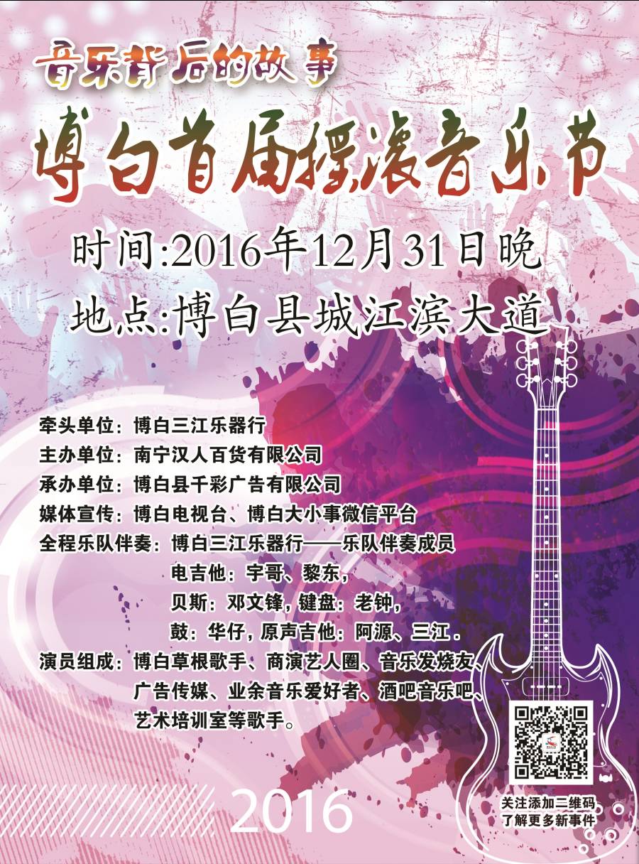 由于时间关系,筹备仓促,本届摇滚音乐节还有众多博白本地重量级、实力派的摇滚歌手和唱将没来得及参演,望谅解!明年举办第二届时将努力邀请到更多博白本土摇滚歌手共同演绎属于博白人的摇滚音乐节!