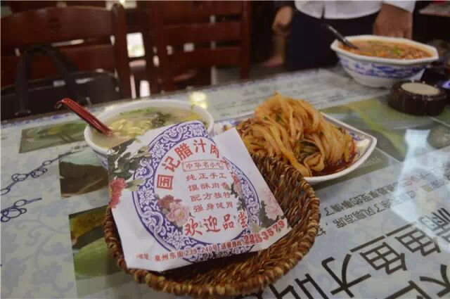 一一0.5的正宗西安美食+0.5的泉州本土文化=1家国记肉夹馍。每张桌上,都介绍有不同的家乡美食。哪儿的面好吃,哪儿的肉夹馍出名,哪儿的水饺棒......