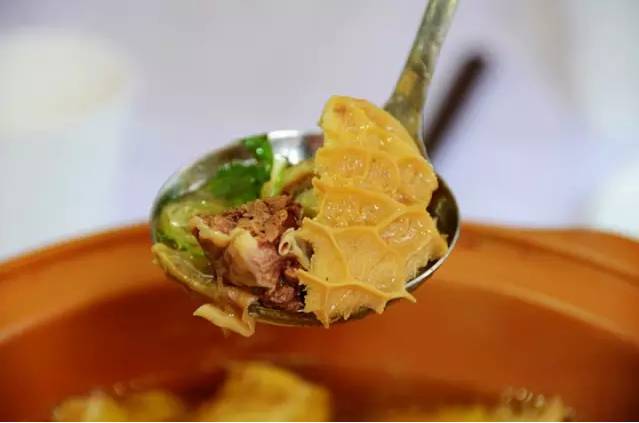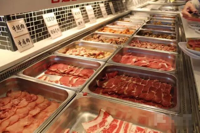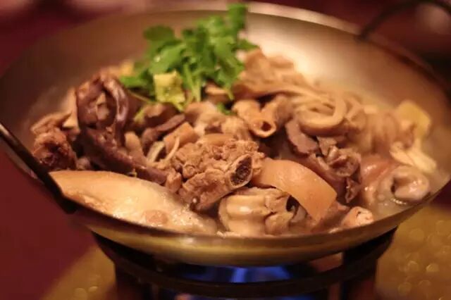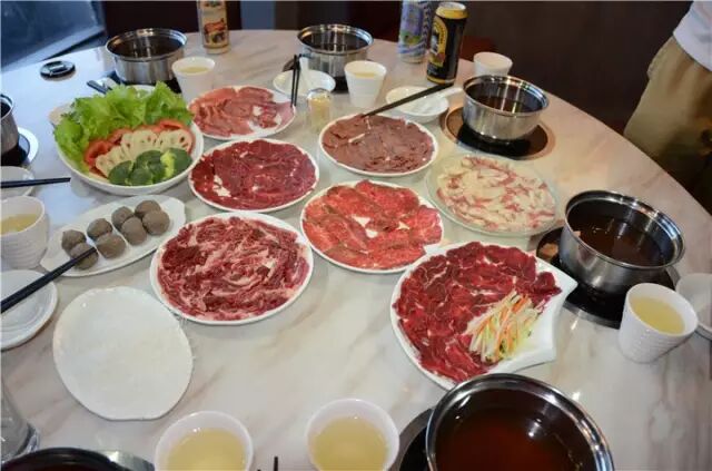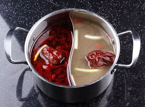 一一锅底比较特别,锅具自然也其他火锅店的不同,总得分成三隔,放三种味道:中间有一个小锅,放德庄汤,其余两边分别是滋补汤和红汤。