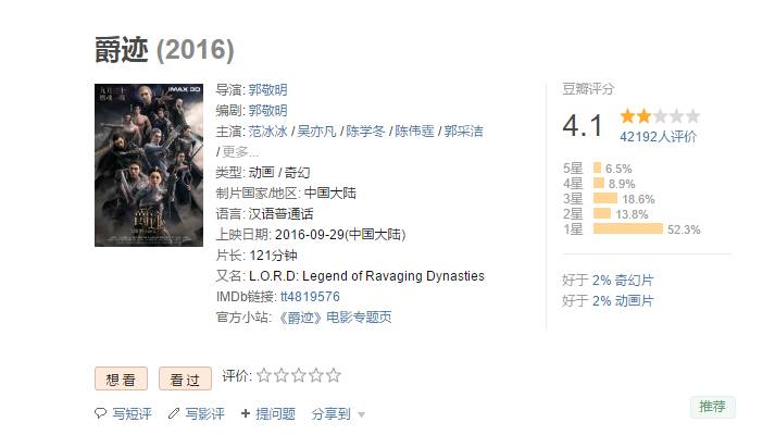 最后给个总体评价,豆瓣上的评分是合理的,这片子虽然剧情混乱不堪,人物刻画没有力度,再加上刻意卖腐,头身比例严重失调,在大场面的设计上充满劣质感但还没有说烂到无法看下去的程度,在CG的制作上至少范冰冰的脸是很合格的,苍雪之牙做的也还行只可惜便当领的太早,成功将国产片特效层次从5毛升级到一块。还有就是电影开始女王爵只有一位,结束的时候已经至少3位了,彰显了女权主义,值得赞扬(就这样吧,我编不出来优点了)。