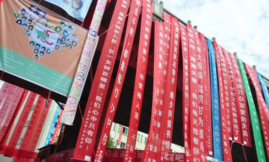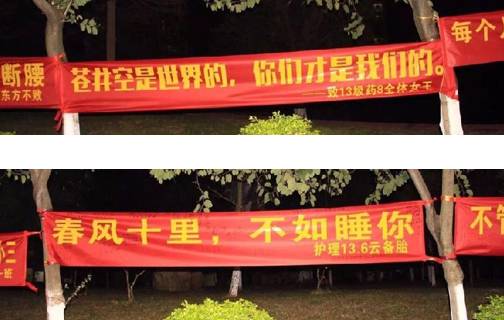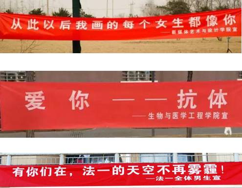 而近几年,男生们不再满足于私下里送送礼物鲜花,开始更加高调地在校园里挂横幅标语,向女生示爱,一时间成了一种潮流。