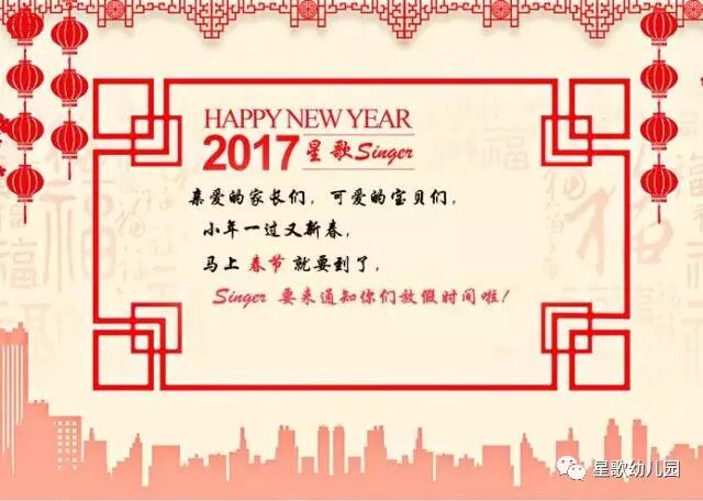 星歌幼儿园将于2017年1月21日(腊月二十四)-2017年2月5日(正月初九)放假, 共计16天, 2017年2月6日(正月初十)正式开学, 2017年2月5日(正月初九)新生报道、办理入托手续。星歌幼儿园全体教职工感谢您的支持和配合,祝愿大家:新年快乐,阖家幸福!