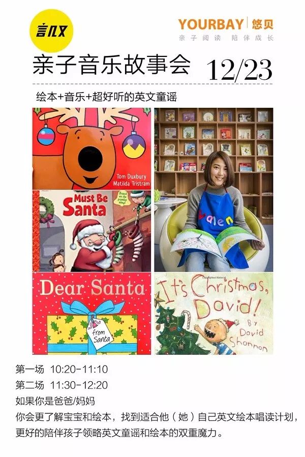 你会更了解宝宝和绘本,找到适合他(她)自己英文绘本唱读计划,更好的陪伴孩子领略英文童谣和绘本的双重魔力。圣诞亲子音乐故事会每场仅有20组家庭名额,还不来抢!