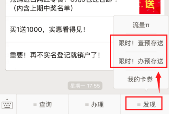 二、在底部菜单栏“发现”->点“限时!查预存送”,““限时!办预存送””
