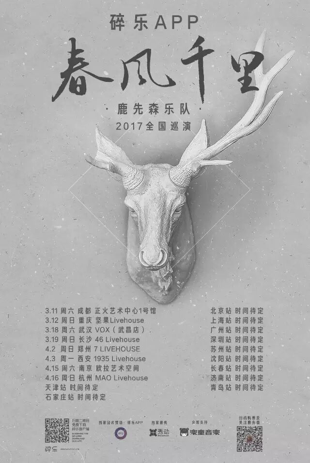 本轮巡演特别感谢碎乐APP对鹿先森的大力支持,我们将继续在碎乐APP上传音乐作品,并将在每场演出现场设置与全场乐迷互动的“碎乐时间”环节。