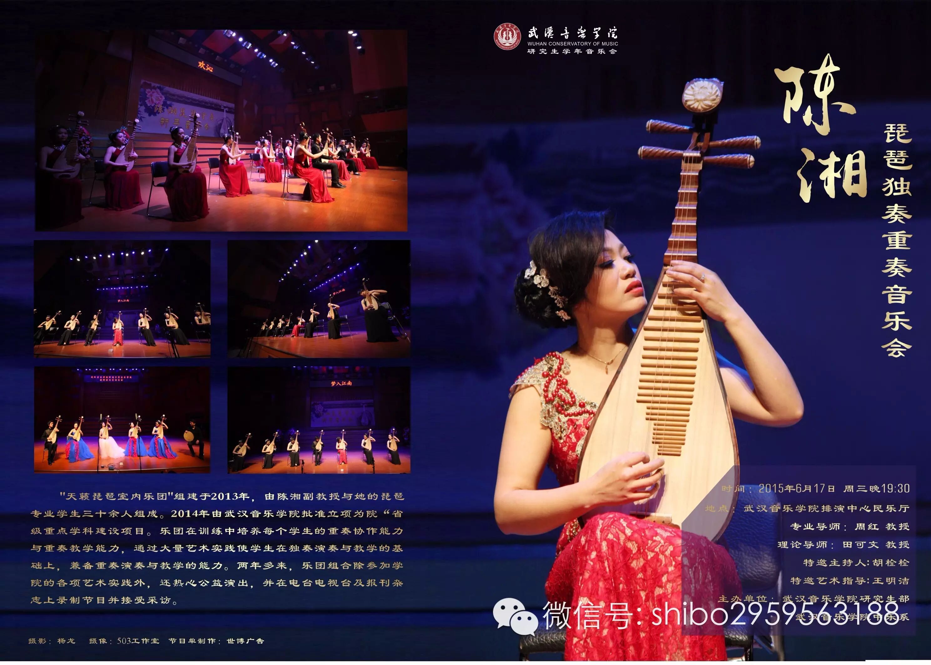 "天籁琵琶室内乐团"组建于2013年,由陈湘副教授与她的琵琶专业学生三十余人组成。2014年由武汉音乐学院批准立项为院“省级重点学科建设项目。乐团在训练中培养每个学生的重奏协作能力与重奏教学能力,通过大量艺术实践使学生在独奏演奏与教学的基础上,兼备重奏演奏与教学的能力。两年多来,乐团组合除参加学院的各项艺术实践外,还热心公益演出,并在电台电视台及报刊杂志上录制节目并接受采访。
