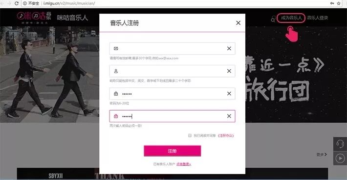 1、登录官网http://i.migu.cn 点击“成为音乐人”,填写邮箱和密码后,点击“注册”
