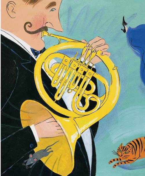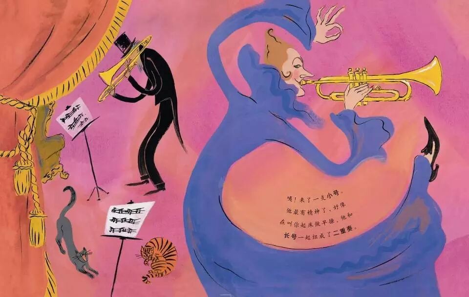 《大家来听音乐会》这本图画书,以轻松、诙谐的笔调,艳丽温暖的色彩,勾勒出各种乐器特别的造型,加上简练的文字、清楚的形容,这些乐器的形象更深刻地印在孩子心中。不过,这绝对不只是一本乐器图鉴,作者很幽默地以每一位演奏者特别的造型、体态及服装,和他所演奏的乐器在造型上相互配合呼应,一方面增加趣味,一方面加深印象。