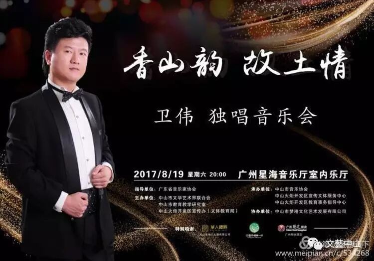 本网讯 8月19日晚,在华灯高照的广州星海音乐厅里,“香山韵 故土情”卫伟独唱音乐会华丽唱响。,中山市文联党组书记、主席陈旭,中山市文联党组成员、常务副主席冯福禄等领导嘉宾观看了演出。本场晚会由广东省音协指导,中山市文联、中山市教研室、中山市火炬开发区宣传办主办,中山市音协、中山火炬开发区宣传文体服务中心、中山火炬开发区教育事务指导中心承办,中山市梦港文化艺术发展有限公司协办。