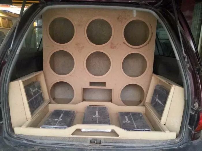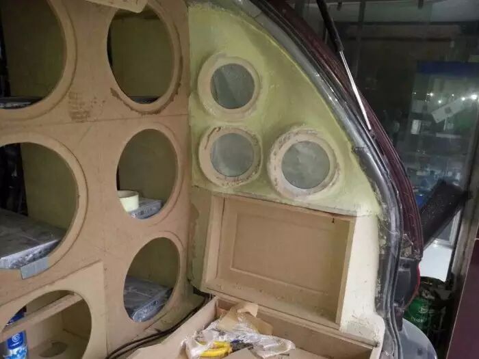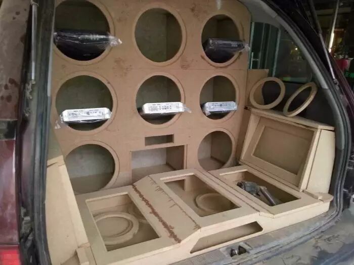 豪客8只低音,一对套装喇叭,一对同轴喇叭,五台功放全部安装完成