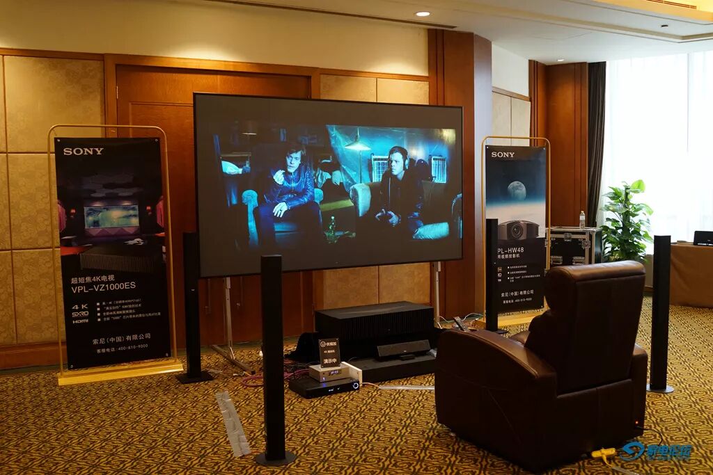 本次展示活动在酒店3楼的西华厅隔出了二个展示区域。外侧的展室有一套Sony超短焦投影机VPL-VZ1000,这次特别投射出最大尺寸的120寸画面,配合Teufel音箱一套小型影院系统,再加上优视加播放器和谛凡喏 D-BOX座椅,展出了一套客厅影院组合。