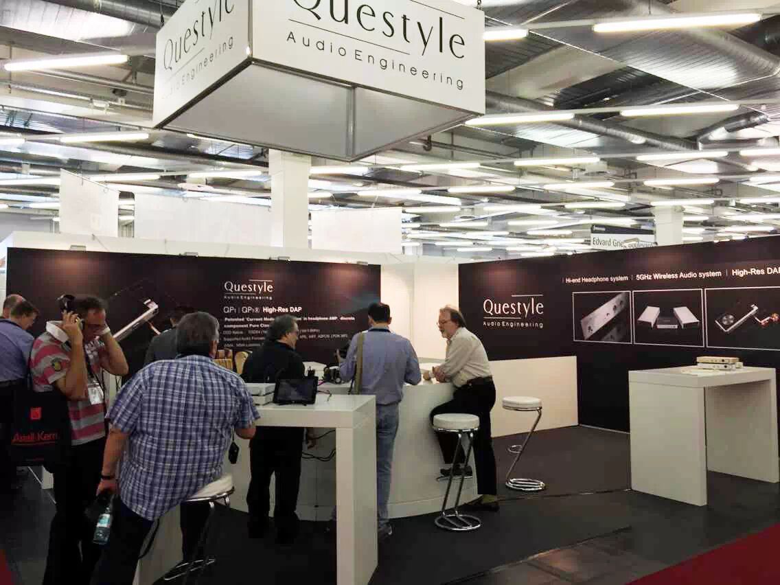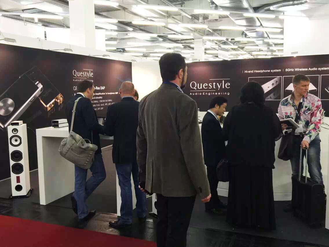 德国慕尼黑High-End音响展是欧洲最大的高级音响展览会,每年都会如期在慕尼黑M.O.C。 超过500家参展商将在约28,000平方米展馆面积展示900多个品牌。 旷世音响的展厅位于3号展厅, G16展位。 展会现场人潮如织,旷世音响(Questyle)总裁王丰硕和美国分公司总裁Bruce亲临现场,为来自全球各地的参观者展示QP1R无损便携播放器。