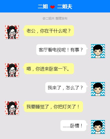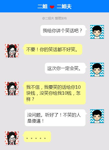 14、一对夫妻吵架,男的吵不赢女的,直接躺在床上,一动不动。女的就问,“你躺床上干嘛”?男的回答,“死了”!女的又问,“死了怎么还睁着眼”? “死不瞑目”!男的回答,女的又问,“那怎么还呼吸”?男的说,“咽不下这口气”!