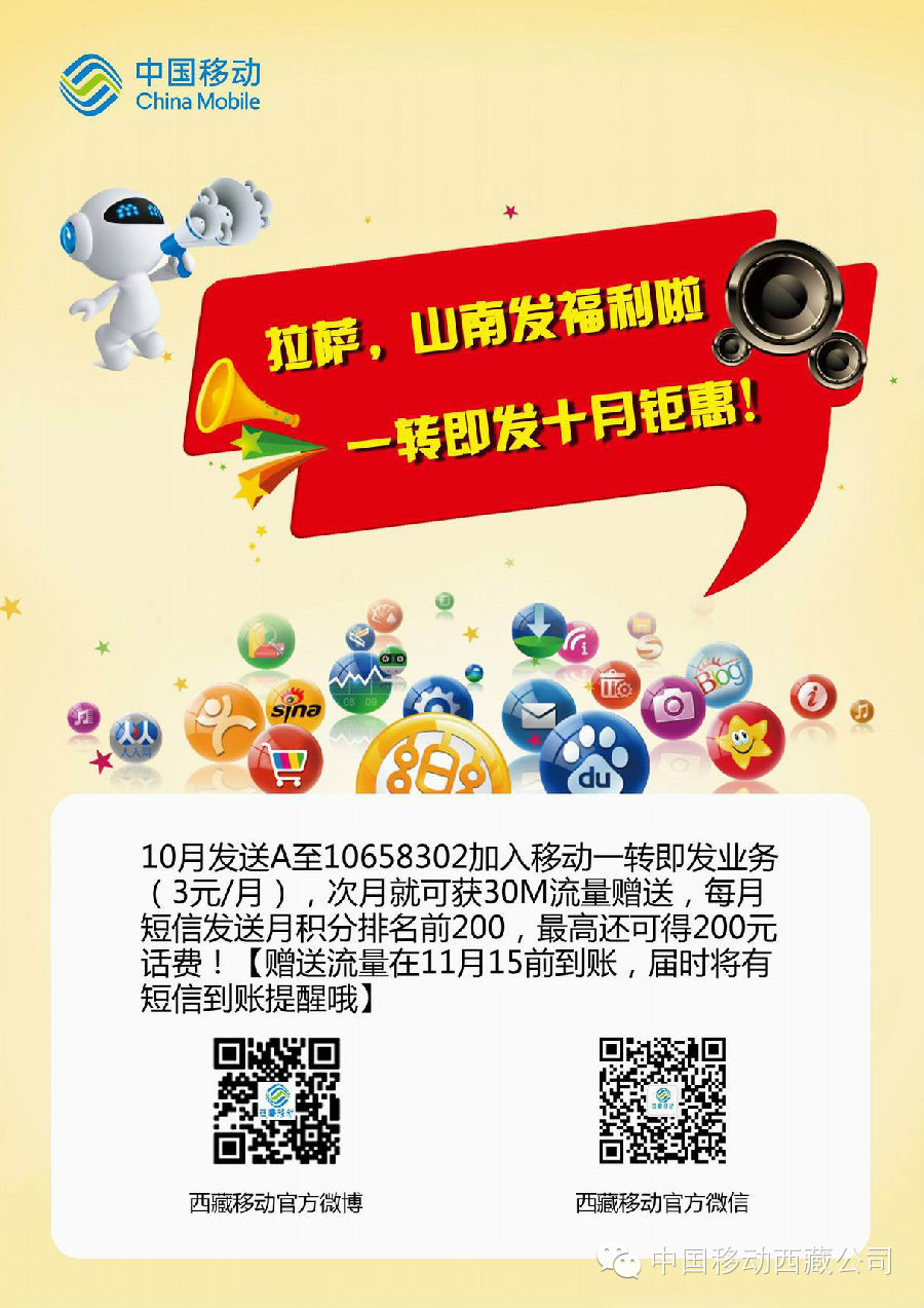 拉萨,山南发福利啦:一转即发十月钜惠!10月发送A至10658302加入移动一转即发业务(3元/月),次月就可获30M流量赠送,每月短信发送月积分排名前200,最高还可得200元话费!【赠送流量在11月15前到账,届时将有短信到账提醒哦】