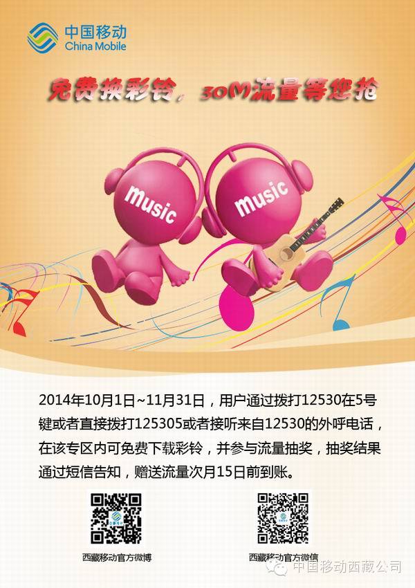 2014年10月1日~11月31日,用户通过拨打12530在5号键或者直接拨打125305或者接听来自12530的外呼电话,在该专区内可免费下载彩铃,30M流量等你来抢,抽奖结果通过短信告知,赠送流量次月15日前到账。