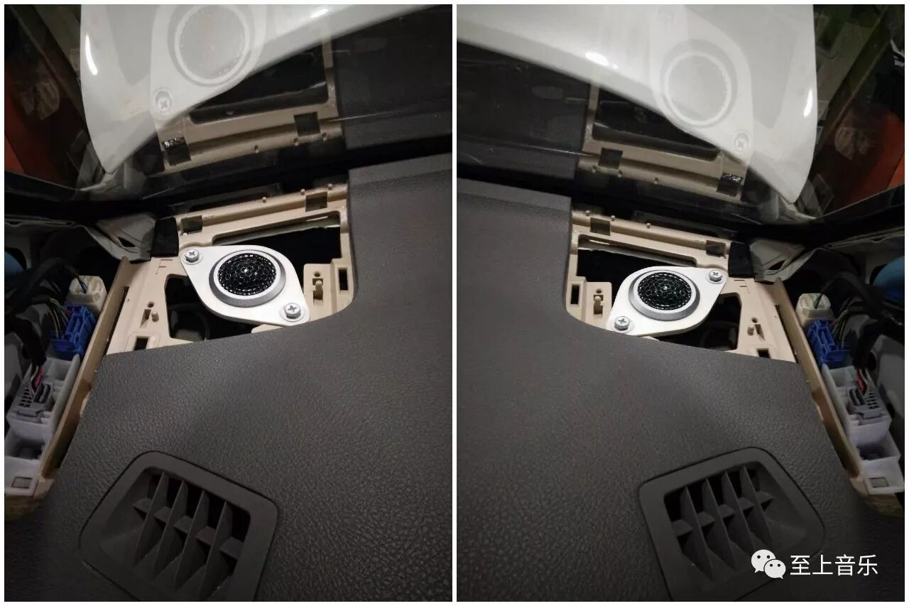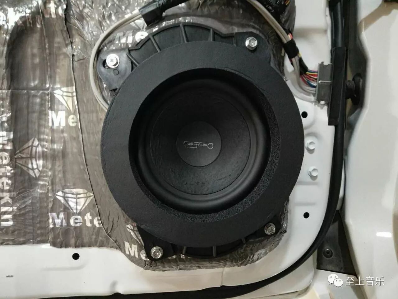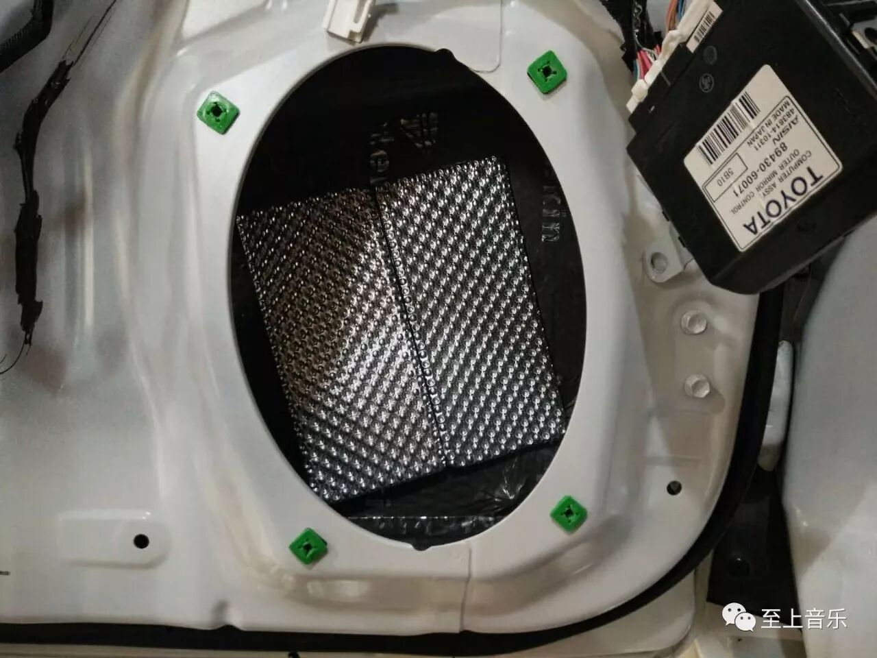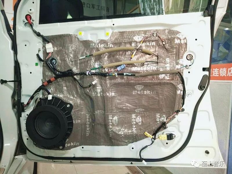 门板双层隔音减震处理完毕之后,在原车喇叭位置安装美特静纯音晶片,辅助车门喇叭发声,使喇叭音效得到100%提升。